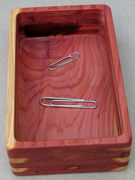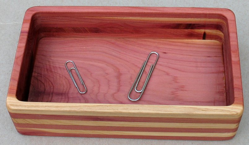 This is a box made out of aromatic cedar. The type of nice smelling cedar you find in closets to keep away insects. I glued together several layers of cedar and cut the box sides as one piece on the CNC. I clamped the outside edges and then profiled the inside walls of the box first. After the inside was cut, I was then able to clamp inside the box and then profile the outside of the box and not have any clamps in the way. The bottom of the box was glued on last. The box smells awesome and so does my shop after I cut this cedar box. |