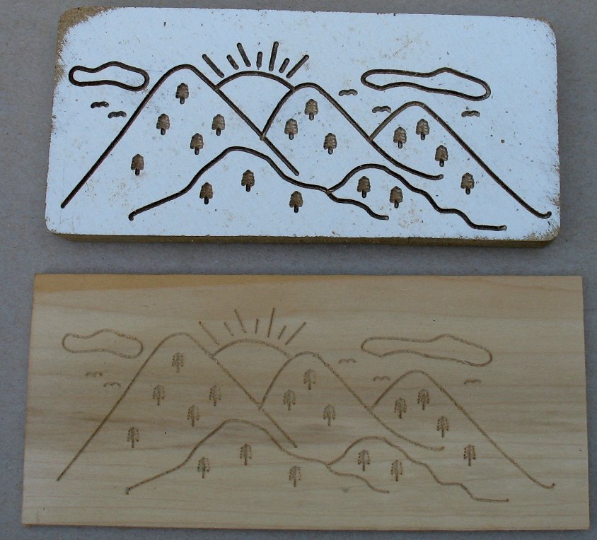 These test engraving pieces are a drawing that my girlfriend and I did in a CAD program. It's a cool little drawing so I decided to test some engravings in different scrap materials I had laying around the shop. |