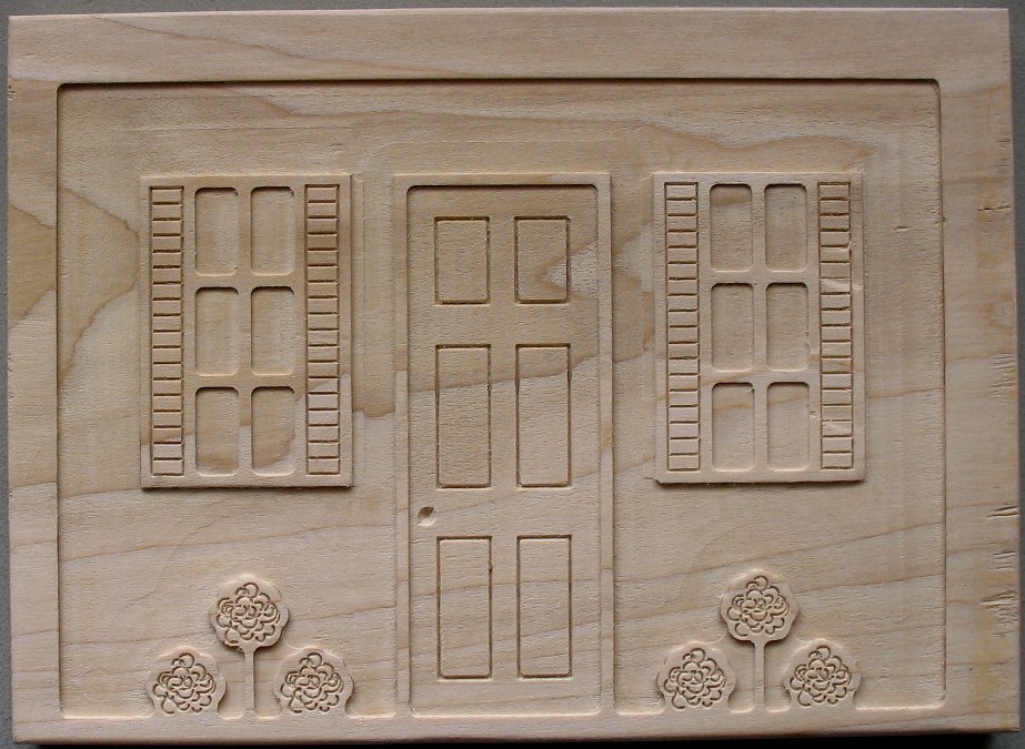 Fancy bird house front. I was experimenting with doing different depth layers. This wood carving used 3 bits. a .25" flat endmill to remove the bulk, a .125" flat endmill to clean up and profile the edges, and a 60 degree engraving bit to carve the details. The shutters, door panels and squiggly lines on the bushes are engraved. |