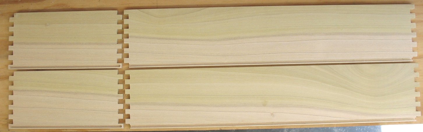 groove for the box bottom. They came out much cleaner than the first set of boxes. On the first set of boxes, I used a table saw to cut the 3" width of all the pieces and I