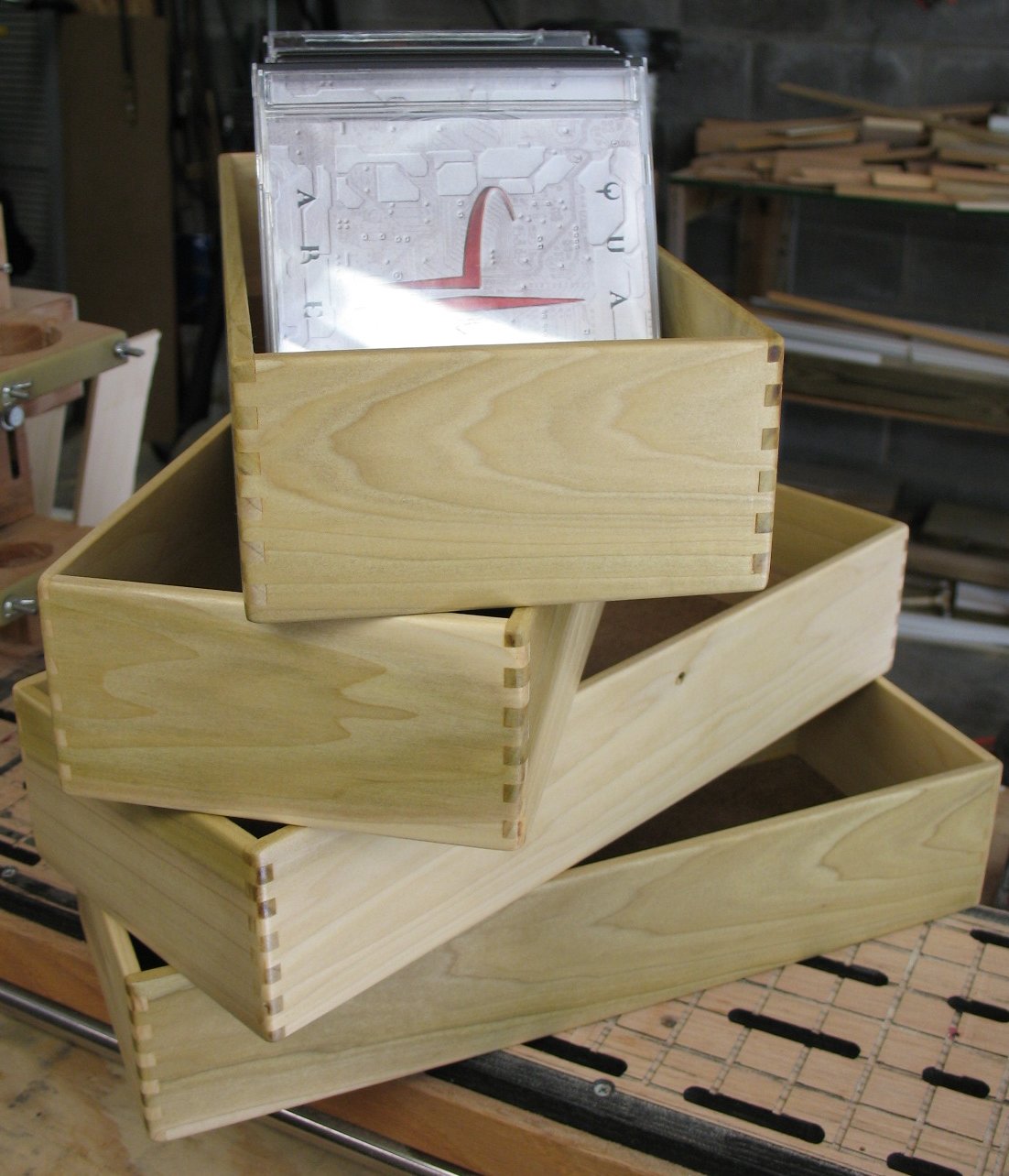 I made four more finger joint CD/DVD boxes. This time I took it a step further and let the CNC machine cut out the box pieces and also cut a
