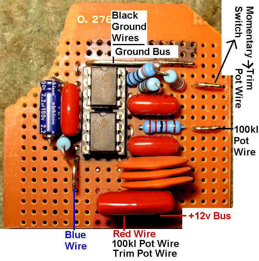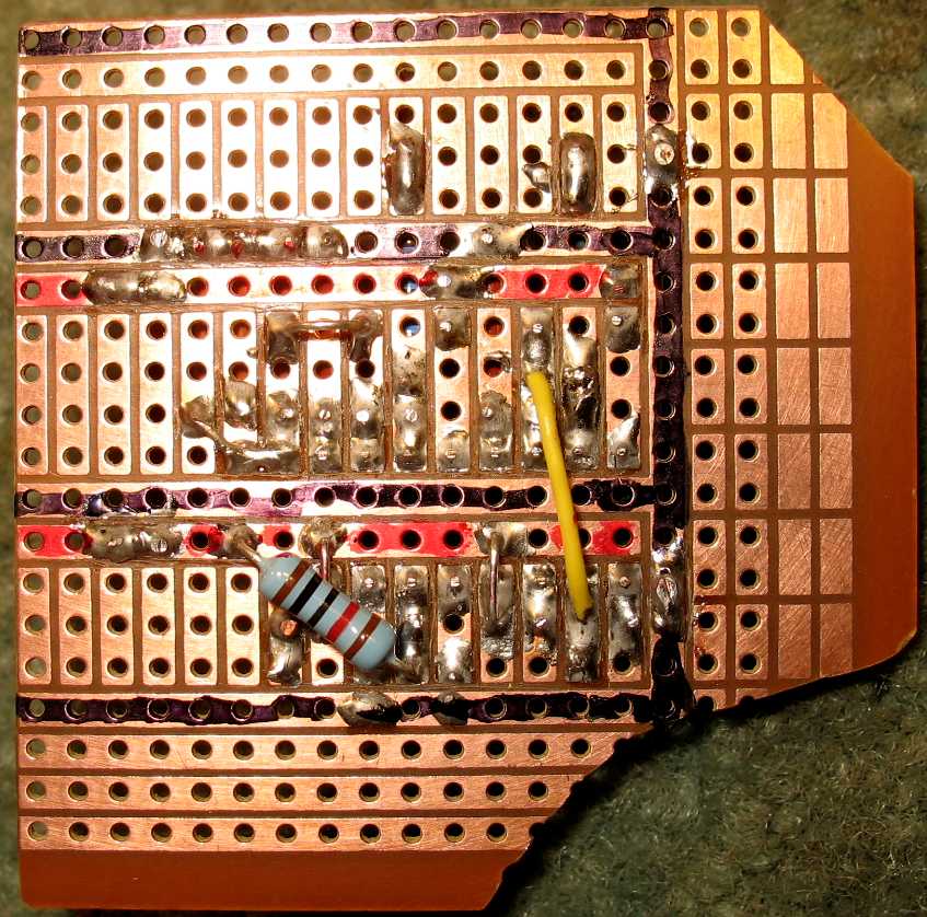 Here's a shot of the back side of the board It was nice that the board material had copper bus runs on it I had a +12v bus and a ground bus They are colored red and black with a sharpie pen The copper buses allowed me to keep the jumper wires to a minimum |