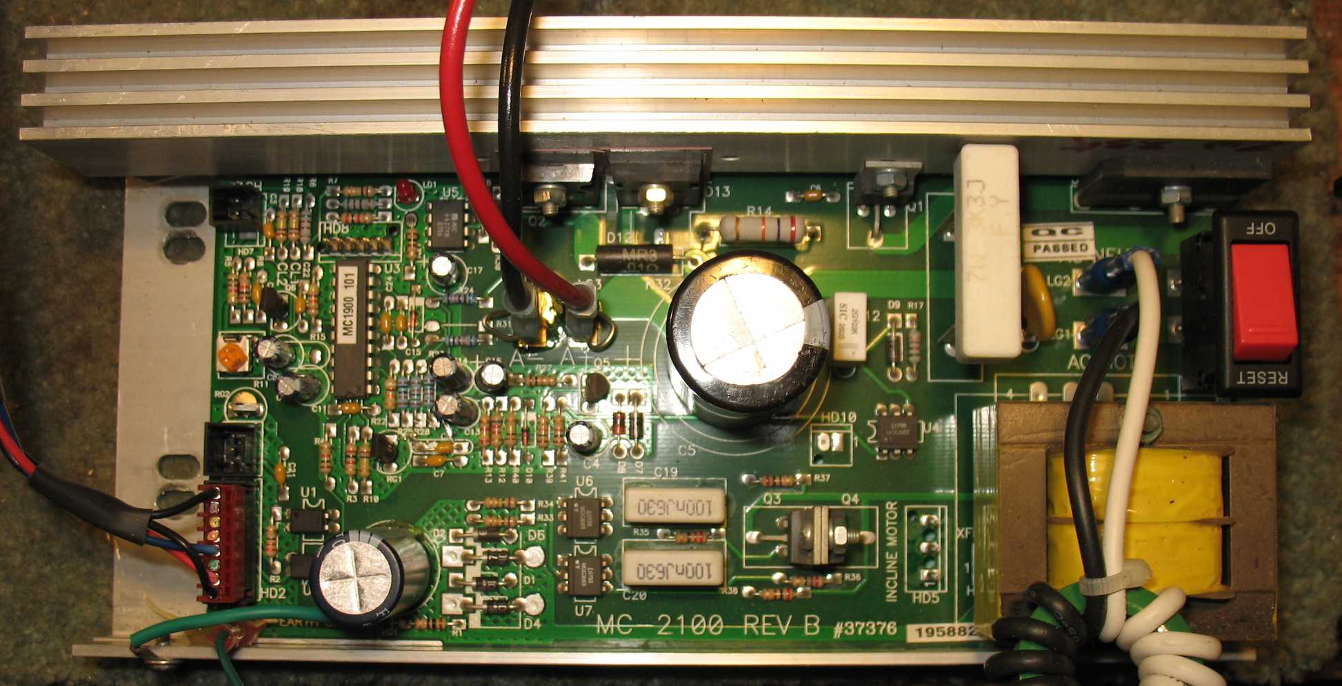 People are using treadmill motors to replace motors and pulley belts in drill presses, lathes and other machines That makes it nice if you want to get rid of pulleys and belts to control the machine speed Changing speeds on a drill press becomes way easier and faster The speed of a DC treadmill motor can be controlled via a circuit board Treadmill motors are heavy duty DC motors and have lots of horsepower Plus, they have a heavy metal flywheel which gives them a nice smooth power band The treadmill motor shown on this page is 2.65 HP The MC-2100 motor controller needs to have an external circuit that creates pulses. These pulses tell the MC-2100 how fast to drive the treadmill motor The circuit that does this on a working treadmill is up on the user console So when you get rid of the console, you need to replace that circuit in order to drive the MC-2100 board. Note that other treadmill motor controllers like the MC-60 are self contained All you need is to solder a speed pot onto a MC-60 board I found a non working Gold's Gym 450 treadmill on Craig's list for $10 and it had a MC-2100 motor control board This page describes how I built an external circuit to drive the MC-2100 control board |