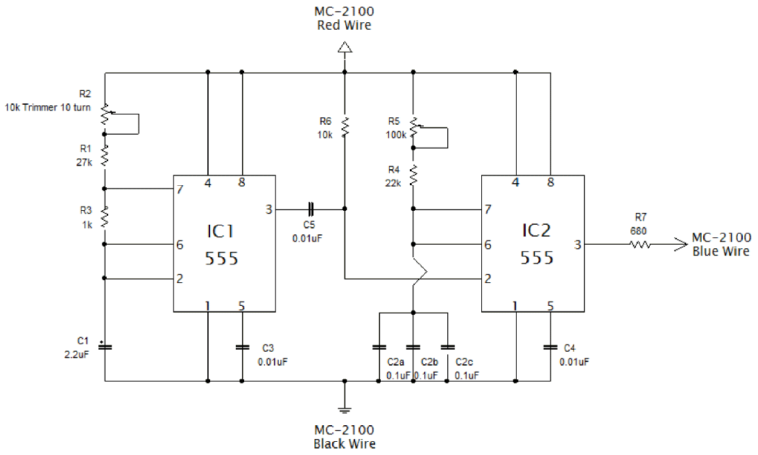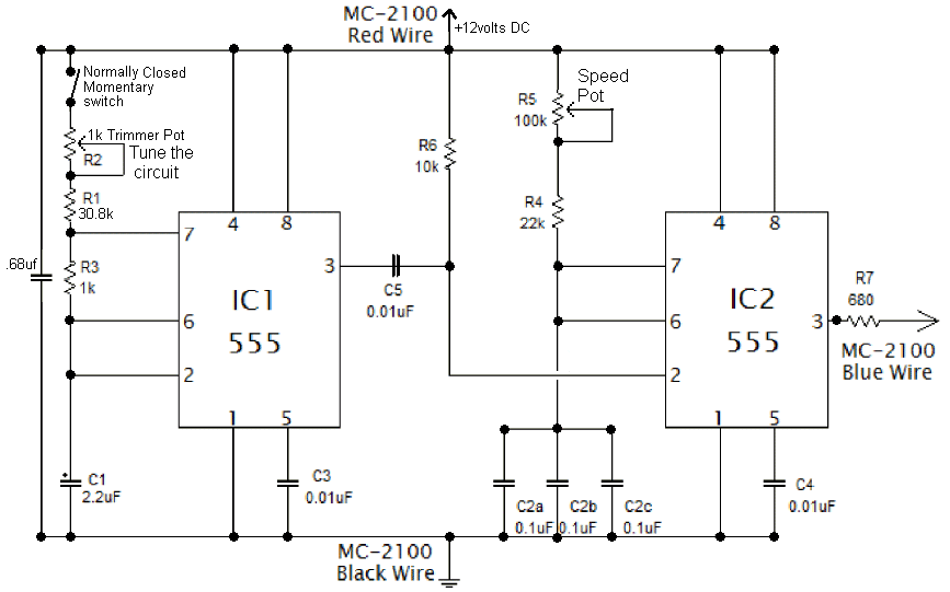 This is the original circuit that I found on the web It creates pulses and drives the MC-2100 speed control board using a couple 555 timer IC's Thanks to Terry and Schoolie for the info on the MC-2100 The Sons of Invention MC-2100 information web page is located here Here is a link to Terry's PDF build document Read Terry's PDF document for details on how the circuit works and lots of building notes You may not understand and all that is going on here with my build unless you read Terry's PDF document Terry's PDF document has the MC-2100 schematic, terminal descriptions and lots of other good info I ended up modifying Terry's circuit in a couple places - See my modified version below |